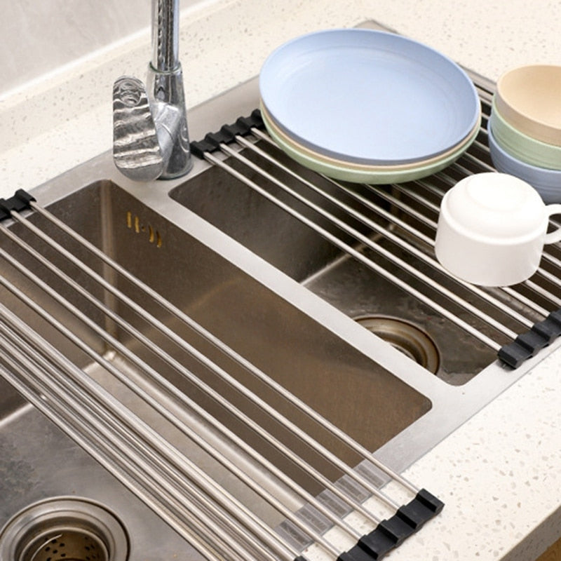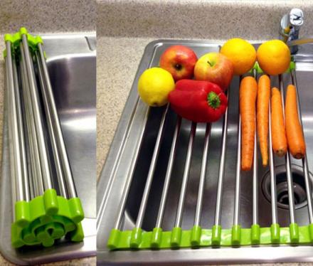 - MULTIUSO: Economizador de espaço sobre o escorredor de pratos da pia para secar ao ar tigelas lavadas, panelas, frigideiras, talheres, panelas, talheres e assim por diante; escorredor de legumes e plataforma de preparação sobre a pia.